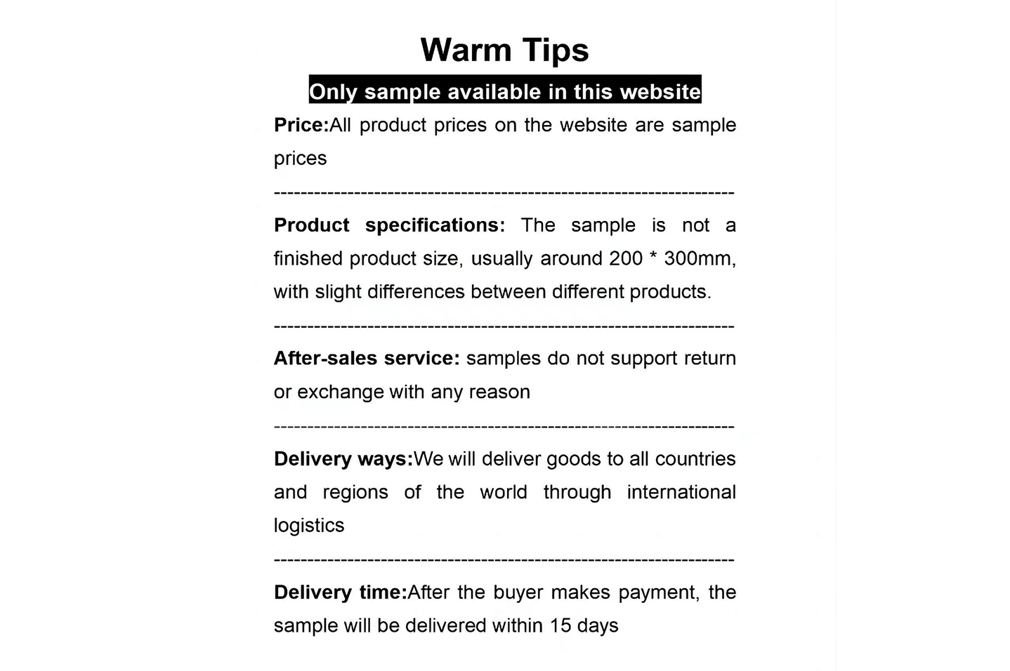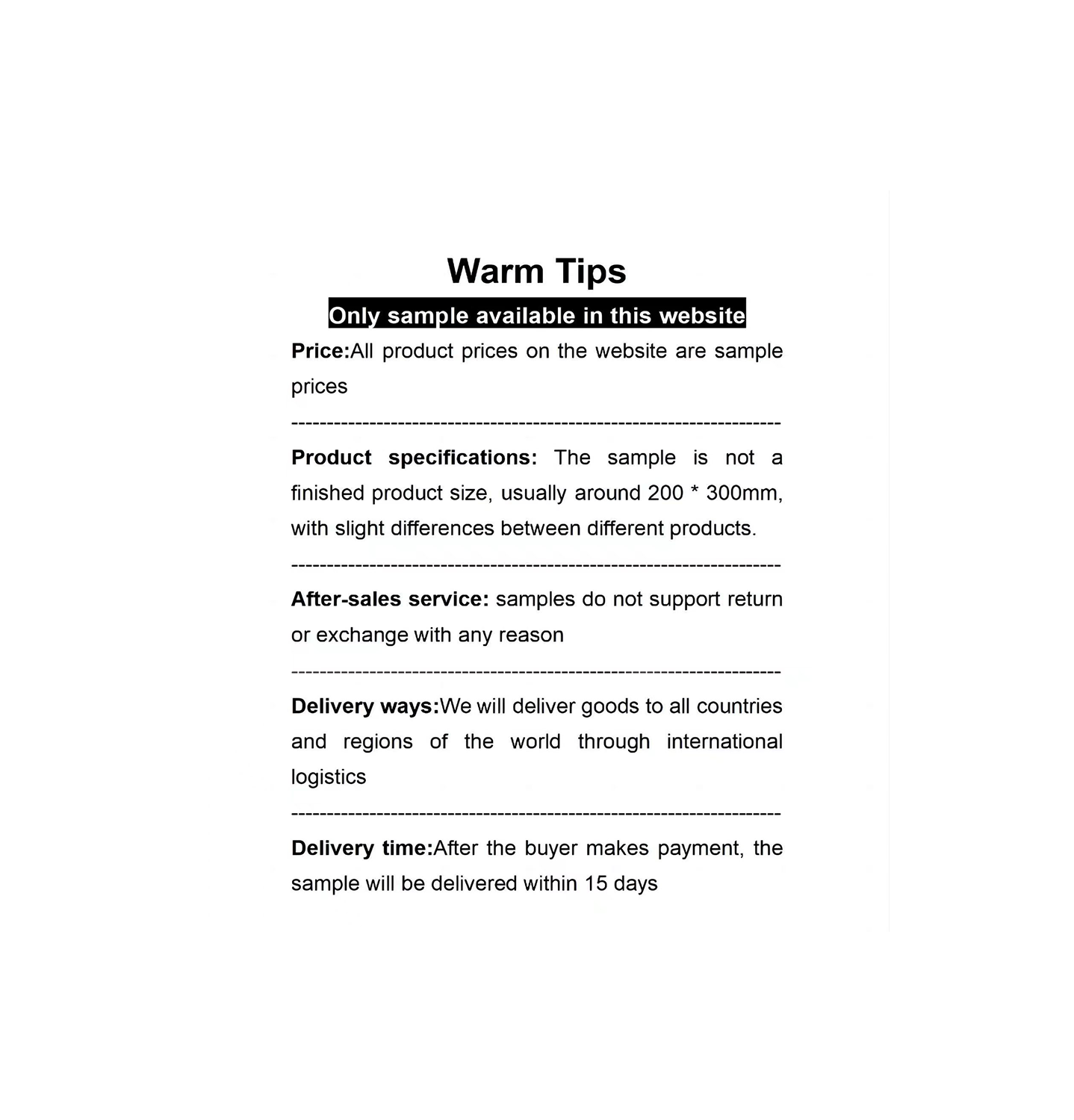 Product specifications: The sample is not afinished product size, usually around 200*300mm,with slight differences between different products.